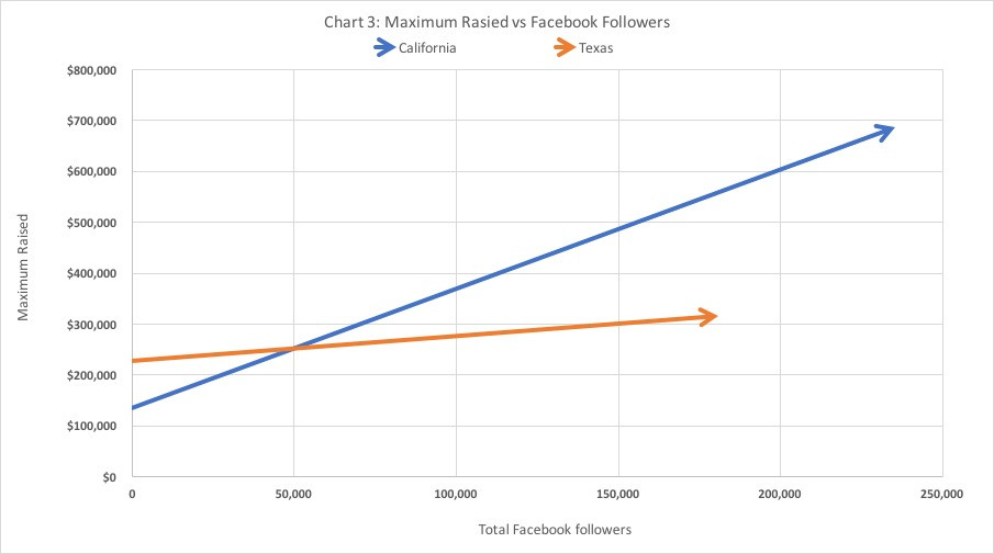 在加州,粉丝的数量对众筹结果有着重大影响。而这可能是由于硅谷在该区的影响力。由于在加州,各个公司对传统风险投资的狂热,使得其他一些公司不得不另辟蹊径——利用众筹网络或者粉丝经济来获得融资。而在德州,竞争没有那么激烈,创业者们有充裕的时间来寻找金融机构以获得融资。