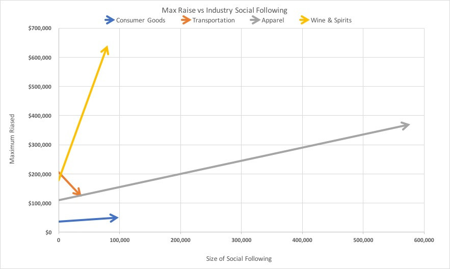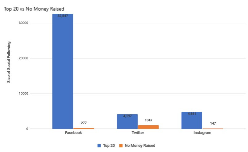 我们认真分析了在众筹活动中,获得融资金额最高的20家公司,每一家公司都获得了50万美元以上的融资数额。这些获得高融资金额的公司,粉丝数量远远超过那些融资金额较少的企业。就好像其余公司故意避开粉丝似的。