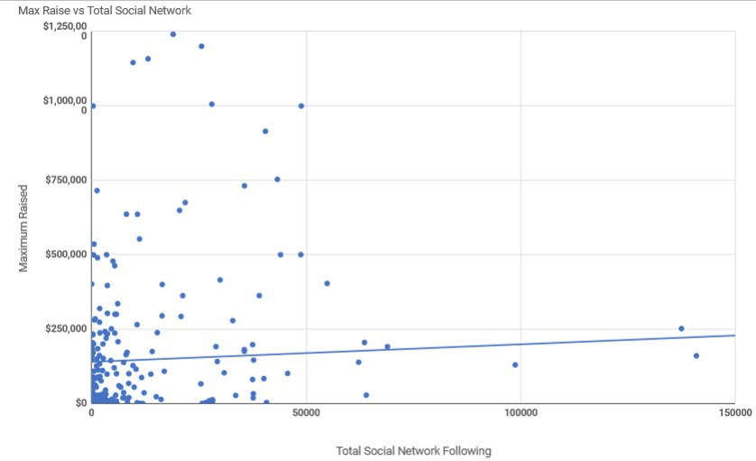 结果有些让人惊讶,数据显示,尽管粉丝的数量对众筹活动有一定的影响,但这也仅仅局限在一个很小的范围内。如下图所示。