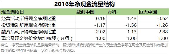 虽然三家的现金流量不同,但我们可以通过其现金结构,看看经营活动、投资活动、筹资活动的现金净额在总现金增加值中的比重,这可以一定程度上反映企业现金来源。通过三家的对比可以发现,融创经营活动所得现金与增加净值的比值为0.16,融资活动则为2.02;万科这两个比值则较为平均,分别是1.43和1.13,说明融创更为依靠外部融资而来的现金,财务杠杆更高。