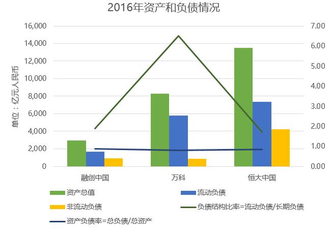 最后,我们来看看三家公司的负债情况,从整体资产负债率来看(负债总额与资产总额的比例关系),三家企业的资产负债率都在80%左右,融创和恒大稍高,万科稍低。