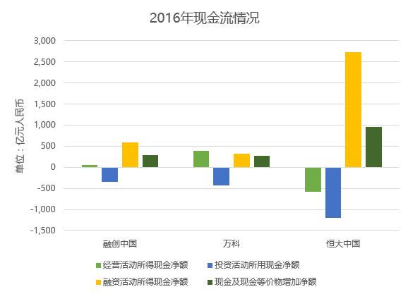 看了昨天的新闻,你可能以为融创融资最腻害,但其实恒大也不赖。虽然恒大的经营活动与投资活动所产生的现金流均为负值,但通过融资活动,有着大量现金净流入。因此成为三者中账面资金最多的。