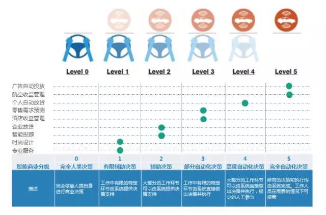 我们知道自动驾驶领域对自动化程度有一个从level 0到level 5的分级方法,这里我借用这个体系对不同行业的智能决策支持的自动化现状做了评价。