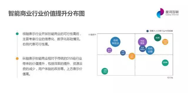 这是我们做的一个智能商业的行业价值提升分布图(上图),显示了哪些行业会更早地从智能商业的实施中尽快得到收益。横轴是从可行性角度,纵轴是从价值提升角度。可行性考虑的是一个行业的数据化和信息化基础,价值提升更多的是考虑一个行业的竞争激烈程度,决定了这个行业企业是否有足够动力用更激进的方法增强在商业竞争中的竞争力。