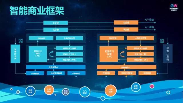 这就是我们提出的智能商业框架(上图),可以看到这个框架跟传统的BI模式在单体层面上基本类似,都是有一个数据层,一个模型层,上面有应用层,但是这一代跟上一代有什么不一样的地方呢?
