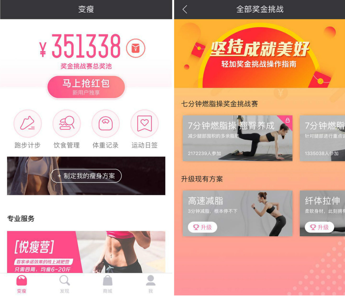 在运动板块,和大部分运动APP 类似,轻+ 也开发了自己的视频课程,前面提到,如何能够让用户坚持下去是保证最终效果的关键,轻+一方面将课程时间压缩到 7 分钟,让减肥“简单易行”,至于“坚持”这件事,除了开发了线上拍档功能,让用户互相监督外,还推出了“奖金挑战赛”的环节,以现金奖励和押金扣罚来激励用户完成课程。此外,在公众课之外,轻+ 也推出了“悦瘦营”这一线上减脂营产品。