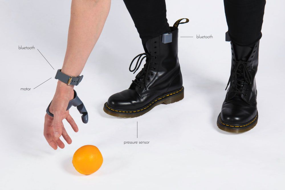 你甚至可以通过安置在你脚底板的压力传感器来告诉“第三拇指”下一步的计划:比如当你想利用其抓取某个物品时,你只要在地上跺一下脚即可。在采访中,Dani Clode提到这十分简单易学。