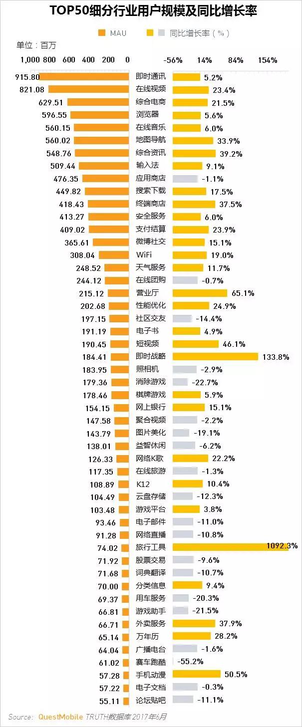 2017年6月同比增长较快的热门行业有:即时战略133.8%(王者荣耀);短视频46.1%,终端商店37.5%,地图导航33.9%;旅行工具1092.3%(共享单车)。