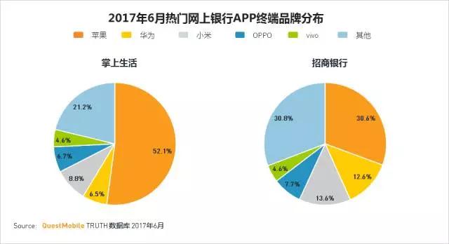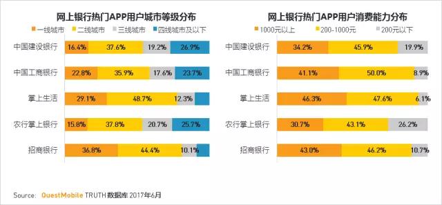 招商银行和掌上生活APP在一线城市的分布最高,其线上消费能力也是最高,体现了其高端用户多的特点。
