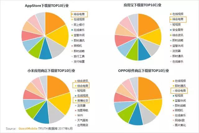 6月是电商大促月,所以综合电商行业在各应用商店下载都排名较前;微博社交行业在小米应用商店表现突出。