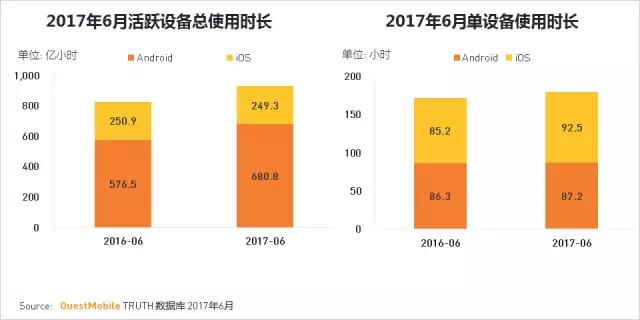从设备时长来看均有不同程度的增长,iOS单设备月度使用时长为92.5小时,同比增长8.6%。