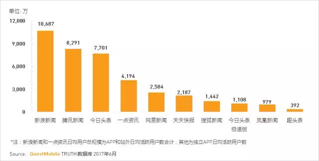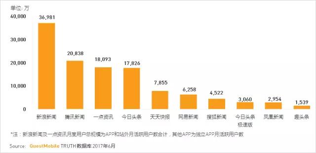 新浪新闻除了其独立APP用户持续增长外,也积极借助移动网页以及微博渠道资源优势做内容分发。2017年6月,新浪新闻生态流量显示月度总用户已接近3.7亿,月日均用户也超过1亿。