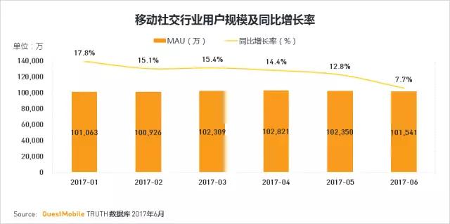 •全民社交已成常态,2017年移动社交行业用户总规模持续超过10亿且较为稳定。