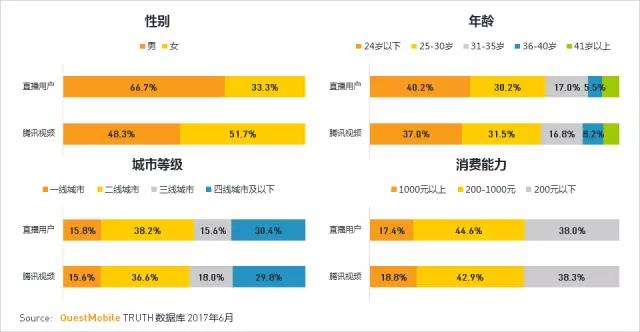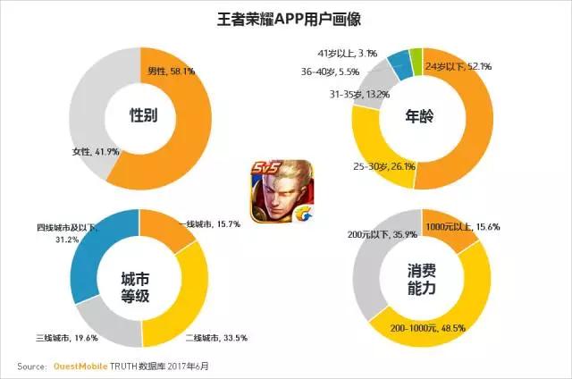 王者荣耀的男性用户占比58%,且24岁以下年轻用户占比超过一半。