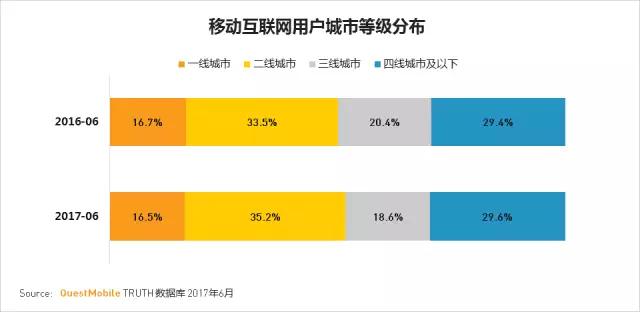 从移动互联网用户城市等级分布看,二线城市占比最高,且与去年同期相比增长最快。