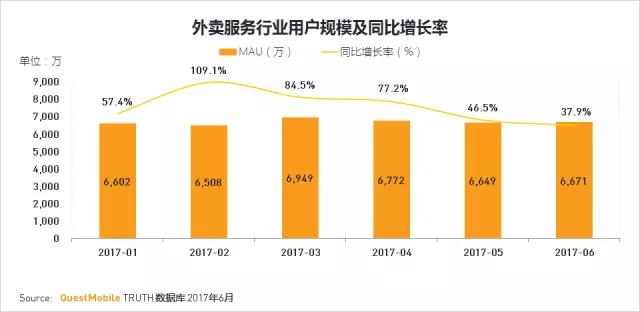 外卖服务行业用户规模超过6000万,趋势也较为稳定。