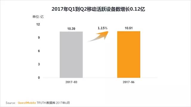 2017年移动互联网活跃设备总数稳定在10亿以上,移动设备在中国普及率高,但增长乏力。从2017的第一季度到第二季度移动活跃设备数增长1200万。