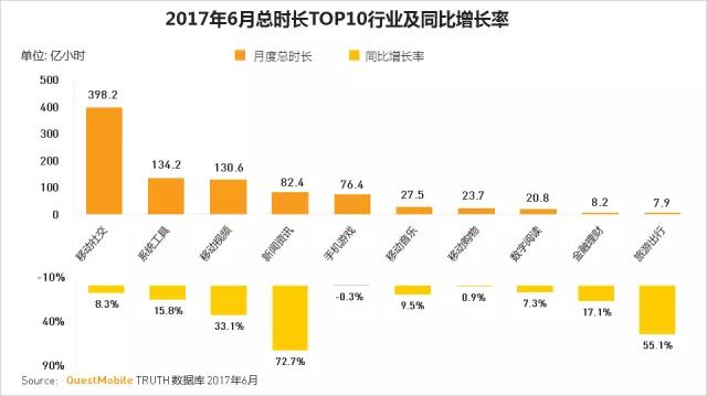 移动社交(包括微信)行业月度总时长遥遥领先;新闻资讯行业总时长同比增长率最高;其次共享单车的火爆而带动了旅游出行整体行业总时长的增长;