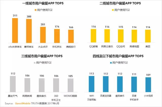 不同城市等级用户偏爱的APP也各有特点,例如共享单车,大众点评等应用更受到一线城市用户喜爱。