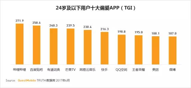 24岁及以下年轻用户偏爱的十大APP分别是:哔哩哔哩,百度贴吧,有道词典,芒果TV,网易云音乐,快手,QQ空间,王者荣耀,美团,微博。
