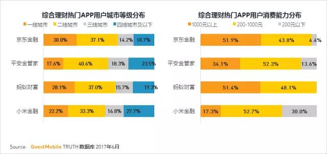 京东金融和蚂蚁财富APP的用户一线城市占比在30%左右,线上消费能力也高于其他同类APP,体现其用户高质量高价值的特点。