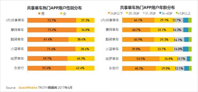 从共享单车行业整体看,用户主要是30岁及以下的年轻人,约占75%;其中哈罗单车的用户最年轻,24岁以下占比达52.5%。