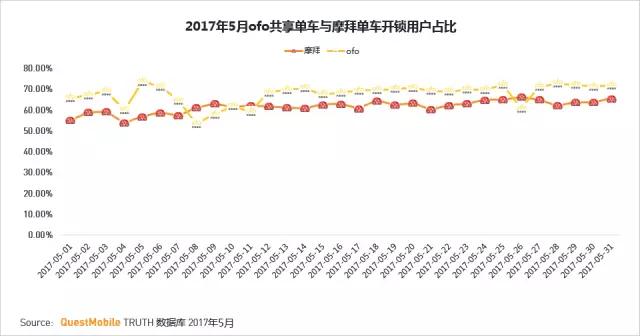 2017年5月数据来看,ofo的开锁用户占比较摩拜高约5个百分点,但摩拜的稳定性更好,波动较小。ofo的开锁用户占比平均在68%左右,最高73.7%,最低53.5%;摩拜的开锁用户占比平均在62%左右,最高66.6%,最低54% 。