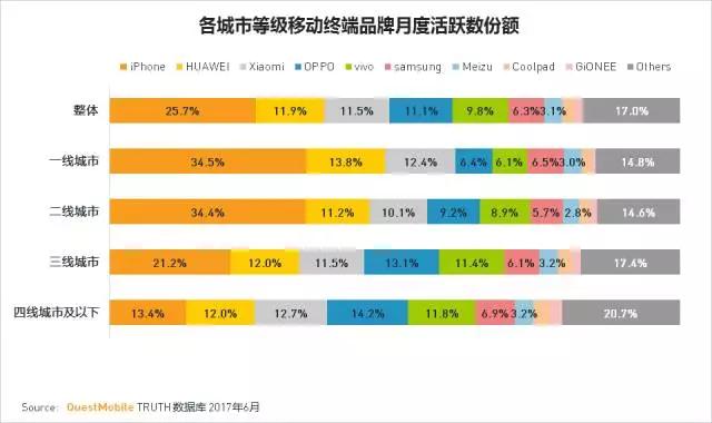 安卓机型中,以小米,华为,OPPO,vivo为代表的中国国产机型品牌强势抢占市场,合计占比44.3%,iPhone依然在一二线城市分布占比最多。