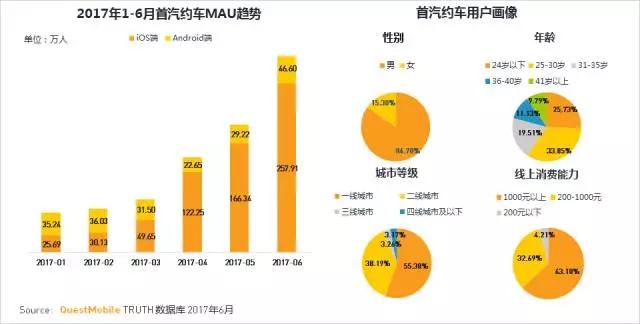 2017年以来,首汽约车用户增长迅猛,6月活跃用户超300万人,是1月活跃用户人数的五倍;且平台以iOS用户增长为主,占比超八成。