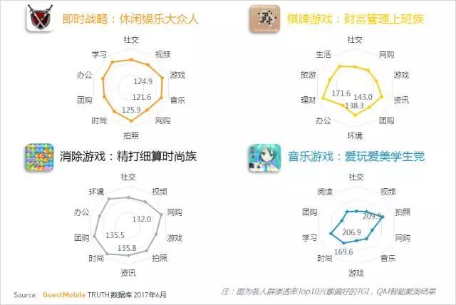 音乐游戏人群则明显偏好拍照、学习和时尚应用(其中拍照应用偏好甚至略高于学习类应用),是爱玩爱美的学生党。