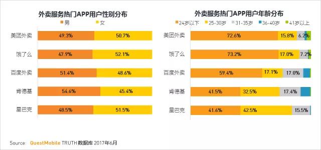 美团外卖和饿了么更受到24岁以下用户的喜爱;星巴克和肯德基受到25-30岁用户喜爱。