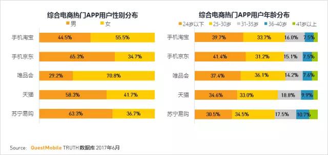 性别分布:京东和苏宁易购的男性占比最高,超过60%;唯品会的女性占比最高,超过70%。