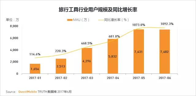 旅行工具包括指南针,共享单车等相关应用,因为共享单车的爆发而快速增长,2017年6月行业总用户已超过7000万。