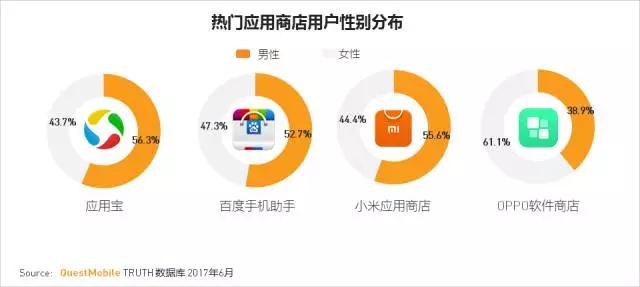 性别分布:大部分较为均匀,OPPO软件商店较为有特点,女性占比超60%。