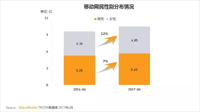 移动互联网网民性别分布较为均衡,男性略多;但与去年同期相比,女性用户增长更快,近一年时间增长超过5000万。