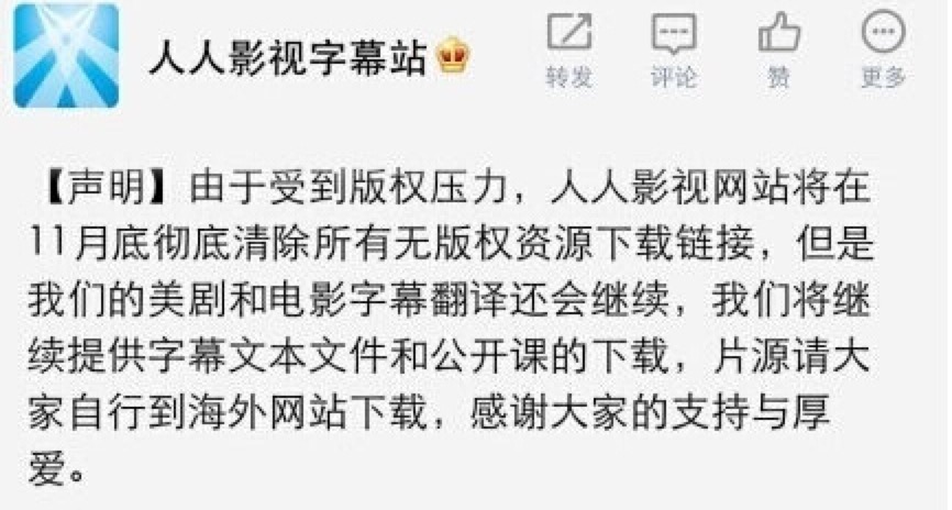 A、B两站已“阵亡”,免费网盘、无偿字幕组和海外影视直播平台也是唇亡齿寒,曾经的教训还摆在眼前:去年6月1日起被关停整改的微盘直到现在也没恢复使用。习惯于在网上搜索免费资源的小伙伴们这回瑟瑟发抖,感受到来自国家监管的暴击。