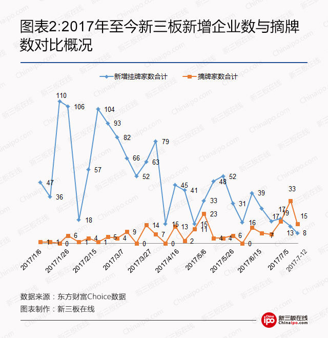 上周(2017年7月1至7日),新三板企业摘牌数首次超过新增挂牌数,摘牌企业数33家、新增挂牌数只有13家。进入本周,这种趋势持续,7月10日至12日才三个交易日,摘牌数15家,但新增挂牌数只有8家。