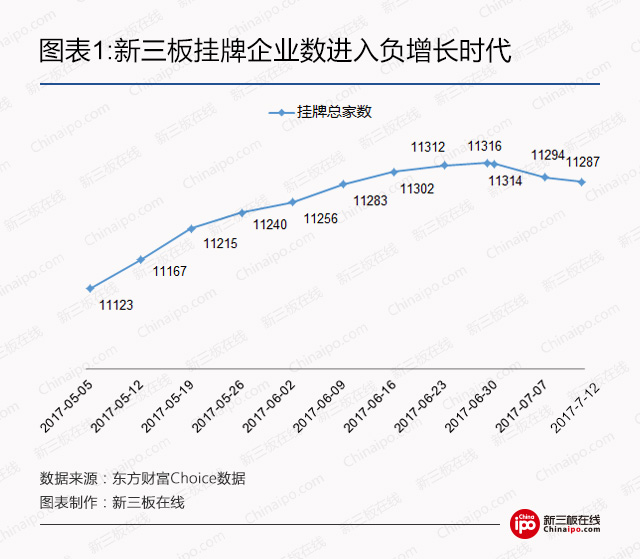 直至2017年6月29日,新三板挂牌企业规模达到历史最高峰的11316家。但次日(2017年6月30日),市场规模开始缩小,当天挂牌企业数减少至11314家,并于下一个交易日(2017年7月3日)回落至11297家。截至2017年7月12日,新三板市场规模降至11287家。