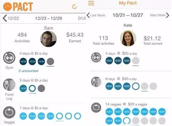 Pact的创始人们想到了一个主意,让大家为自己设定的健身或饮食目标下赌注。你需要真实的拿出钱作为押金,如果最终没有完成,就只能认输,接受损失。这些目标设定会很具体,也不会很长期,实现难度不高,以促进日积跬步,终成千里。用户下注资金一般也是小额的,例如为一周30分钟健身下注5美元。如果目标按预期达成,你不但能拿回押金,还能获得一定奖励。