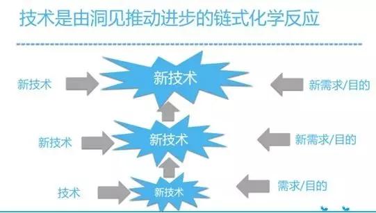 如上图所示,其实技术连接了两个端,一端是需求、目的,另一端是一个已有的技术,将两者结合一起,商业贡献与技术贡献的有效结合形成化学反应,出现了一个新技术,而这个新技术再去满足新的技术,再出来一个新的技术,形成一个化学反应过程。