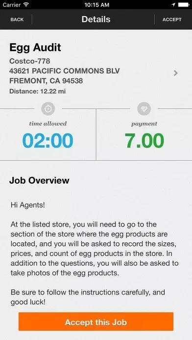 点击某项任务,你可以看到详细的任务要求以及报酬金额,如果愿意的话,你就可以接受这份任务。任务种类很多,包括检查商店的价格、完成一份问卷调查、拍几张某处商业用房的照片等等等等,完成后,你就能拿到2-12美元的报酬。报酬将通过Paypal支付。