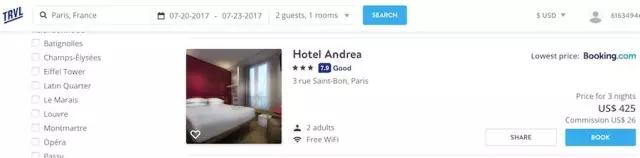 在TRVL的网站上注册登录后,你就可以赚外快啦。比如我想给朋友推荐一家巴黎的酒店,在网页顶端输入城市、入住和退房的日期、房间类型,找到你想要推荐的酒店,点击“share”(分享),就能通过短信、Facebook、Twitter、LinkedIn、Pinterest、邮件来分享给朋友。如果朋友通过你的链接预定了房间,你就能获得高达预定金额10%的佣金。目前,网站只能推荐酒店,但是未来,TRVL会加入机票、汽车租赁、娱乐场所等等等等。