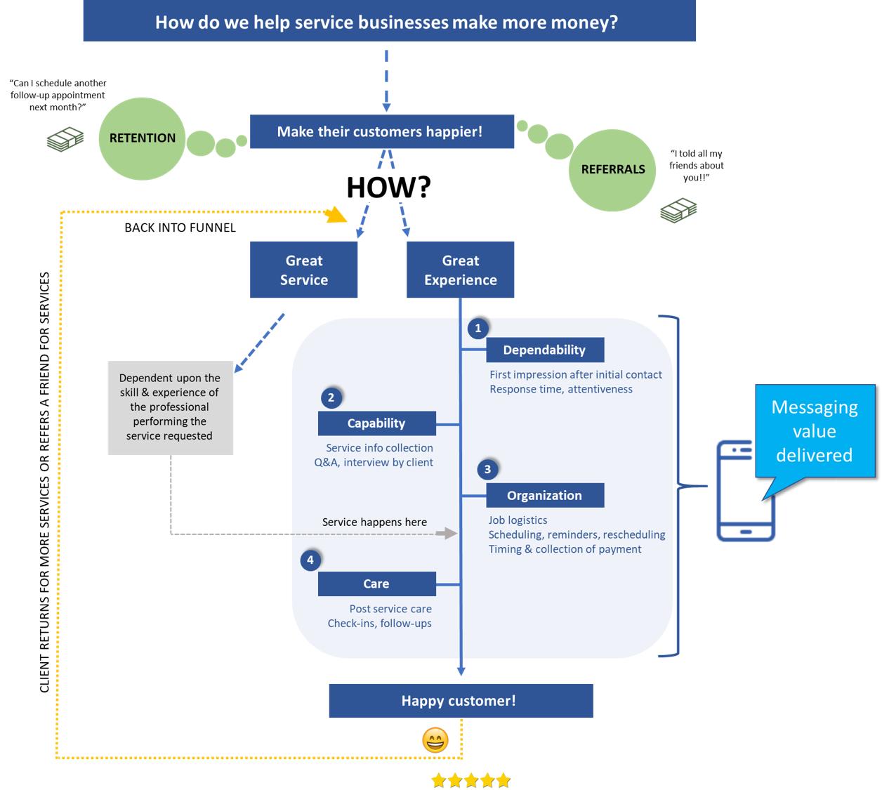 要想赚到更多钱,首先(最终)就是让客户尽可能满意。客户越高兴,再次光顾的可能性就会越高,向朋友介绍你的可能性也会越高。对于大多的服务企业而言,有一个公式就是“服务+体验”,其目的就是让客户高兴。当中一半是服务质量,还有一半是沟通的基本水平。