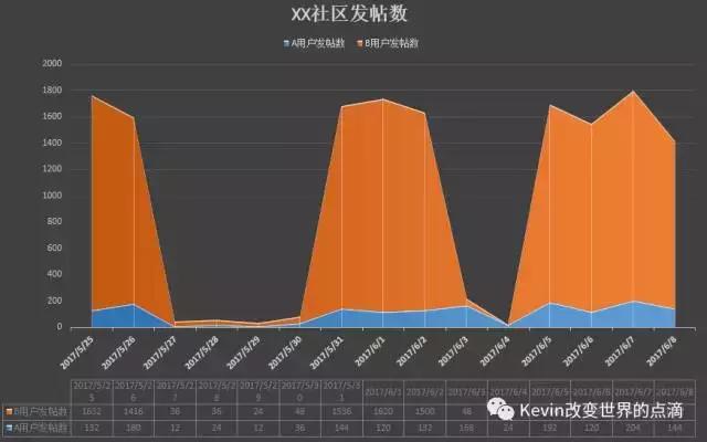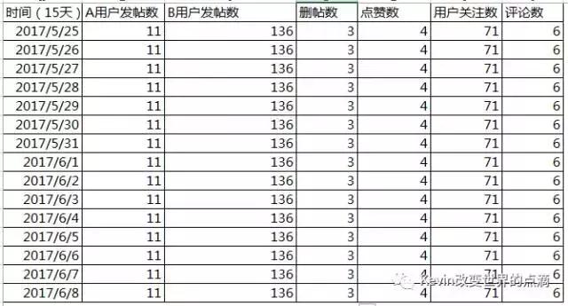 这里还是以UGC FEED流方向来为大家分享我的分析模型,选择我曾经从事过的一个迭代案例来说明下我使用的模型所建的模型,以下是A用户女性与B用户男性在社区中的发帖数随时间15天。