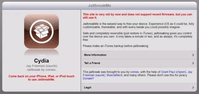 在第一代iPhone发行后,“越狱”曾是风靡一时的文化现象。举几个例子:当时比较有名的黑客家族就有葬爱冷少(划掉)、iPhone Dev Team、Chronic Dev和evad3rs等好几个;然后有一个免费的公开网站jailbreakme.com,只要用手机登录就能一键越狱。