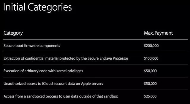下图是“赏金”系统给出的奖励价格,最高上限20万美元,只有当发现的bug属于“安全启动固件”的范畴,才有可能拿到这个数。但是,如果你真的发现这种性质的bug,拿去给别的公司,可能能卖到高达百万美元的价格。所以,黑客社区对这份报价单,可以说是不屑一顾。