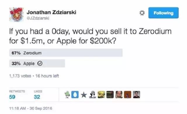 Zerodium的业务模式,和科技公司的“赏金”项目有直接竞争关系。黑客如果发现了重要bug,那是处于绝对的买家市场。有人做了个调查,问如果你发现了零时漏洞,是卖给报价150万刀的Zerodium呢,还是出价20万的苹果?答案可以说非常明显了。