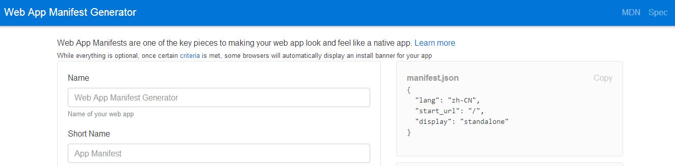 登陆Web App Manifest Generator,输入我们创建的PWA的各种信息。如果有不确定的,可以不填,系统会自动选择默认项。
