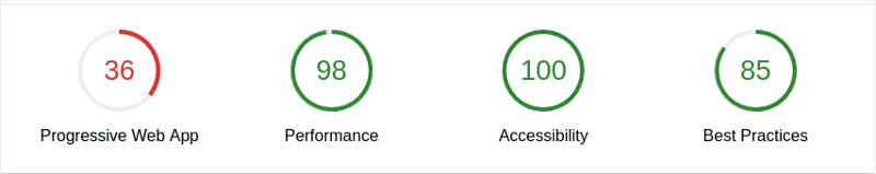 如果感觉信息量太大,看着麻烦,可以直接关注页面顶部的四个主要指标(如下图)。现在我们的PWA基本上还什么都没有,所以得个36分也很正常。