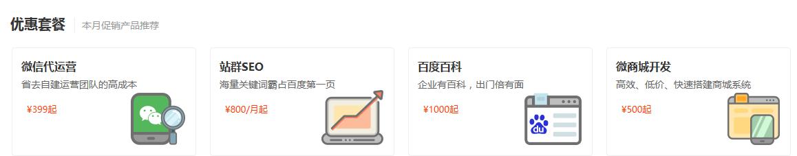 其三,是产品的标准化。坐拥甲、乙方大量数据的情况下,平台会资助开发一系列套餐,以帮助甲方客户更快捷、高效得完成营销工作。比如下图的微信运营套餐,一键 SEO 套餐等。
